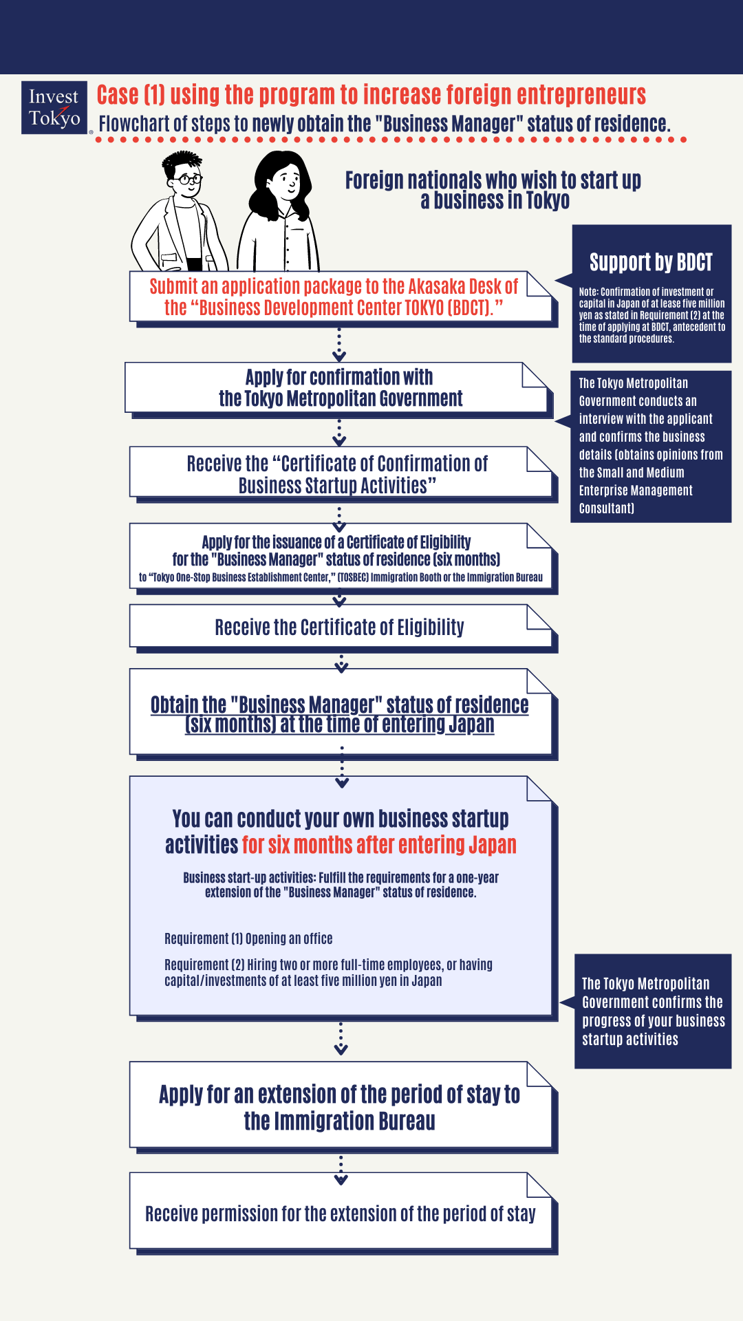 Under the Tokyo Metropolitan Government's Special Zone system, a special six-month "Business Manager" status of residence can be granted if the Tokyo Metropolitan Government approves the business plan and other details before the Immigration Bureau examines applicants upon entry.